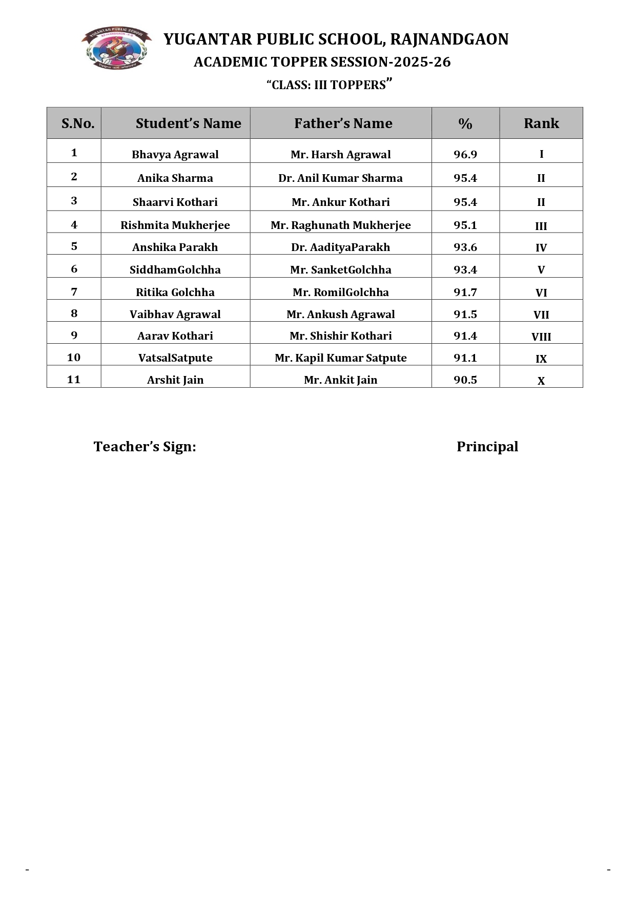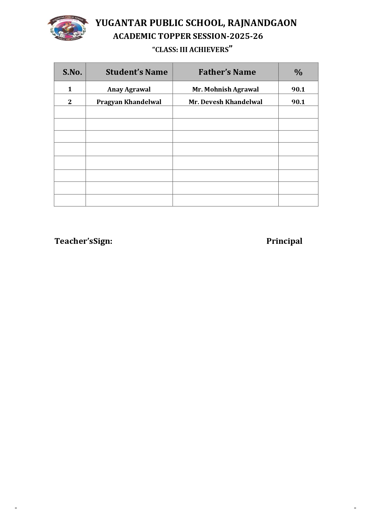 CLASS 3 TOPPER’S &ACHIEVER’S LIST 2025-26 |